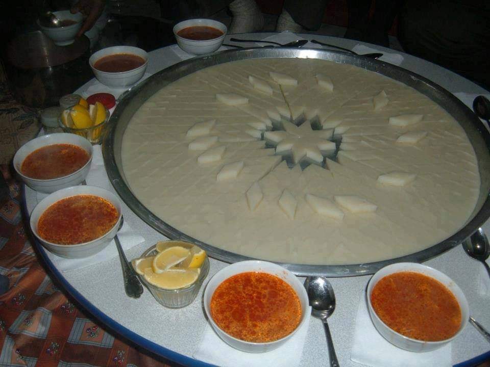Paylaş: 12 BUCAKTA ARAP AŞI-YEMEĞİ Hamur pelte gibi pişirilir, siniye(Büyük tepsi) yayılır, ortası açılır, tavuk etinden yapılmış acılı çorba konulur.