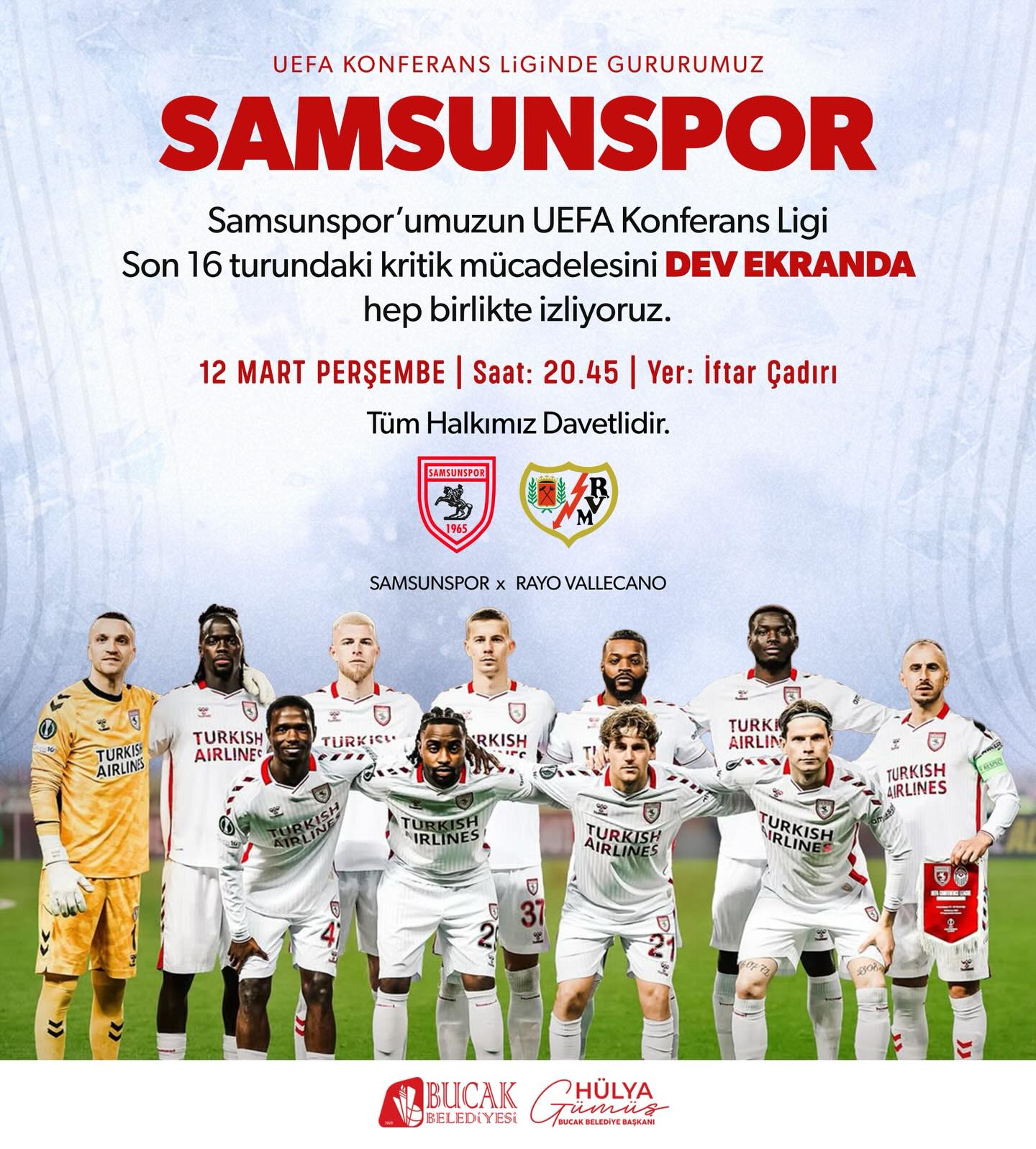 Samsunspor’un UEFA Konferans Ligi Son 16 turunda 12/03/2026 - 12/03/2026 Paylaş: Samsunspor’un UEFA Konferans Ligi Son 16 turunda Rayo Vallecano ile oynayacağı kritik mücadeleyi birlikte izliyoruz. 12 Mart Perşembe günü saat 20.45’te İftar Çadırı’nda kurulacak dev ekranda bu büyük heyecana ortak olmak için tüm halkımız davetlidir. Yer: İftar Çadırı Tarih: 12 Mart Perşembe Saat: 20.45 Son Etkinlikler