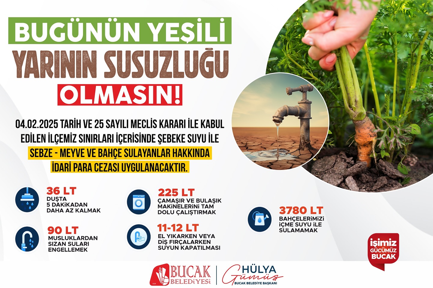 Bugünün Yeşili Yarının Susuzluğu Olmasın! 12.05.2025 Paylaş: 146 Bugünün Yeşili Yarının Susuzluğu Olmasın! 04.02.2025 Tarih ve 25 Sayılı Meclis Kararı ile kabul edilen ilçemiz sınırları içerisinde şebeke suyu ile sebze, meyve ve bahçe sulayanlar hakkında idari para cezası uygulanacaktır.
